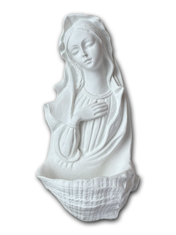 Le blanc mat de la finition, qui lui donne un effet pierre, met en valeur la douceur des traits de la Madone, dans un style épuré et apaisant. De plus, le bénitier est facile à suspendre à un clou sur un mur grâce au trou prévu à cet effet sur l’arrière. Il trouvera tout naturellement sa place à l’entrée de la maison, à côté d’une porte de chambre, ou même dans un petit oratoire.