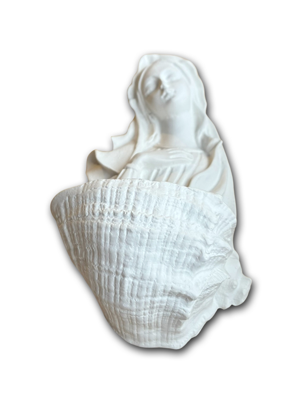 Bénitier imitation coquillage blanc en résine, représentant la Sainte Vierge recueillie, la main droite posée sur le cœur.