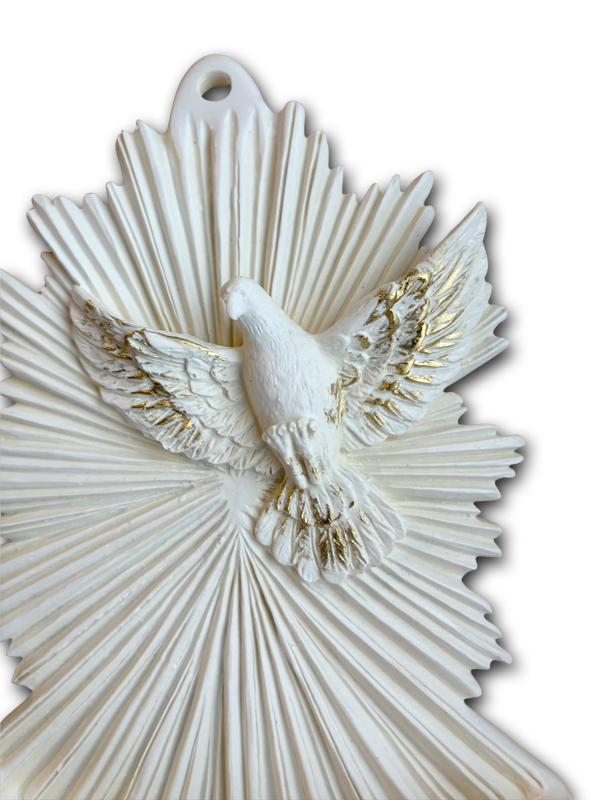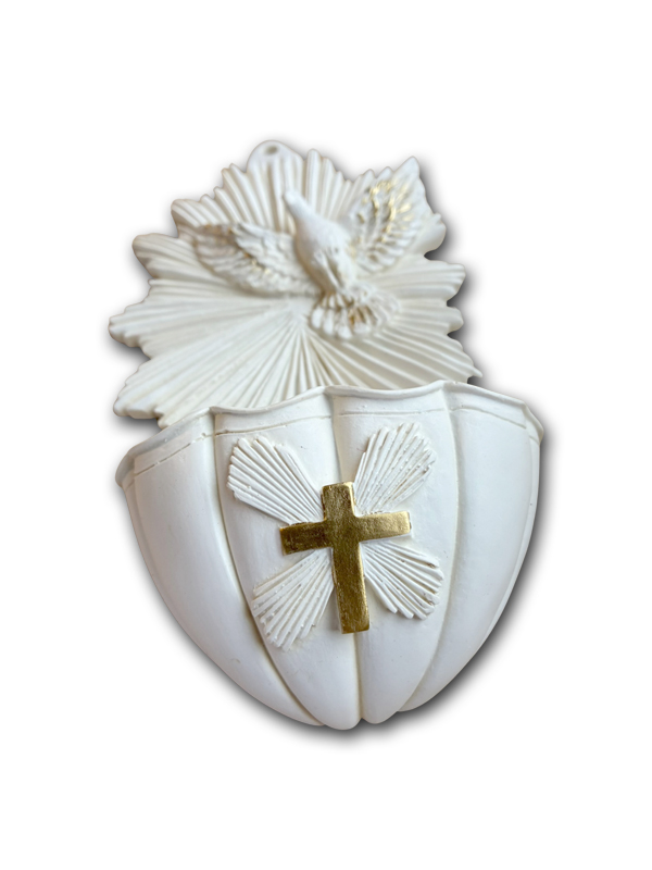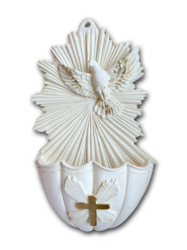 Bénitier blanc en résine effet pierre, avec colombe représentant le Saint-Esprit, les ailes ouvertes, répandant ses dons avec largesse.