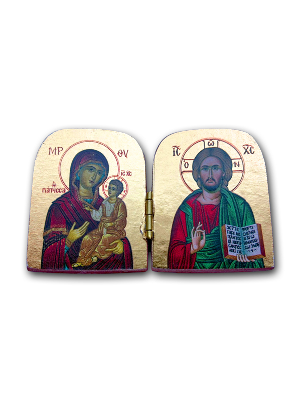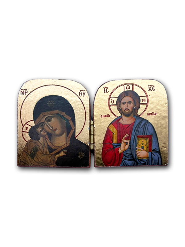 Diptyque pliant formé de deux volets pouvant se rabattre l’un sur l’autre, représentant à gauche, Notre-Dame de Kazan portant l’enfant Jésus dans ses bras, et à droite, le Christ pantocrator, Christ glorieux tenant les écritures saintes dans sa main gauche.