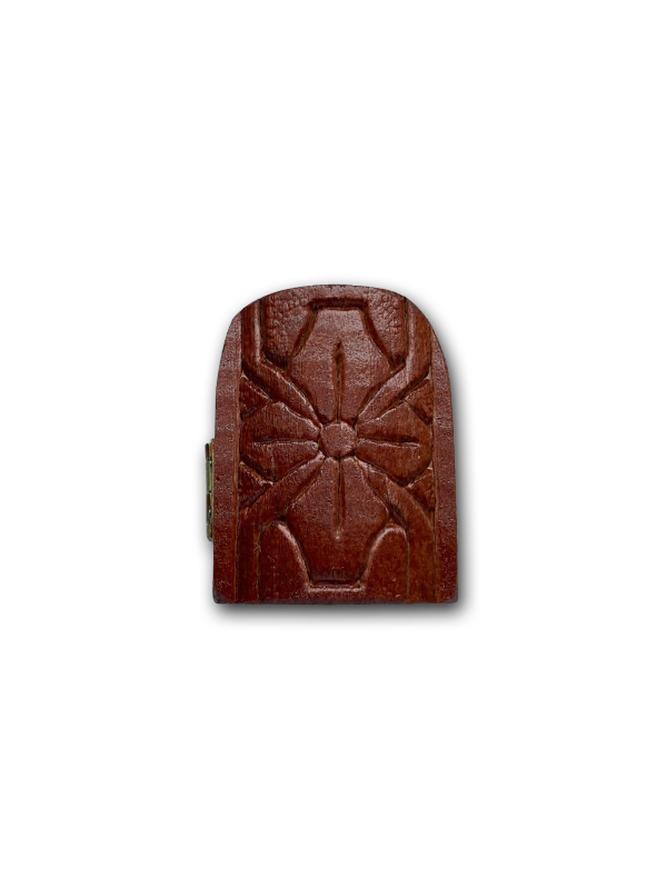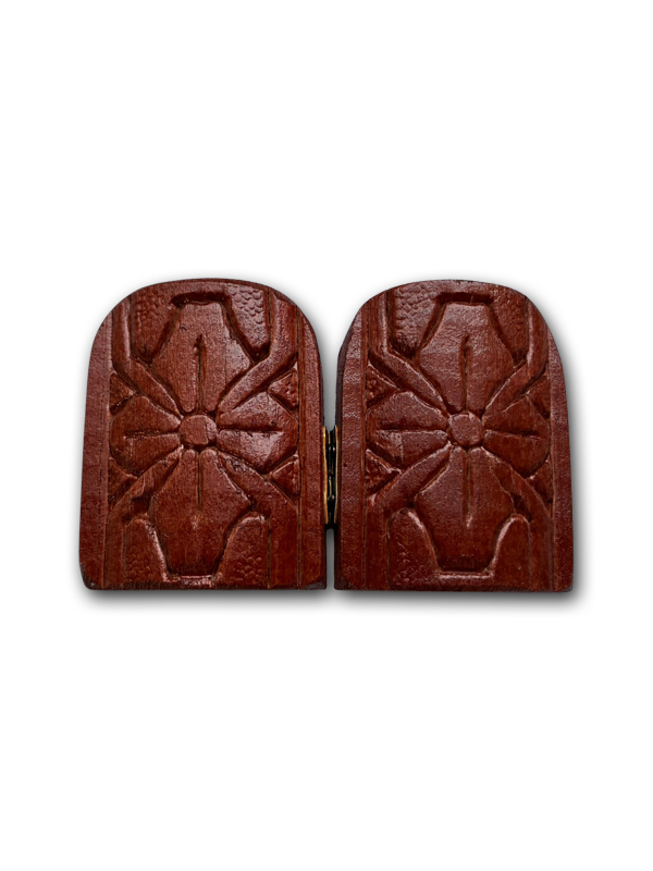 Ce tableau, dont l’extérieur est en bois finement sculpté à la main de manière artisanale, est typique de l’art byzantin traditionnel : le fond est doré, et les couleurs des personnages sont chaudes et profondes. Hautement décoratif, il n’en reste pas moins un appel immédiat à la contemplation ou la prière. Il peut se poser facilement sur un bureau, une étagère, ou être glissé dans un sac de voyage.