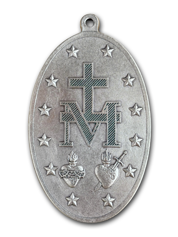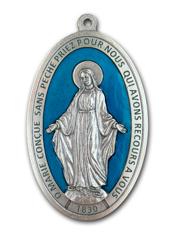 Plaque de porte de haute qualité, de forme ovale représentant Notre Dame de la Médaille Miraculeuse. Très solide, en métal argenté et fond en résine bleue émaillée et lumineuse, elle sera parfaite pour sublimer votre porte d’entrée, porte de chambre, ou tout simplement en suspension murale partout ou vous voudrez. La fixation est aisée grâce à l’anneau supérieur prévu à cet effet sur la médaille.