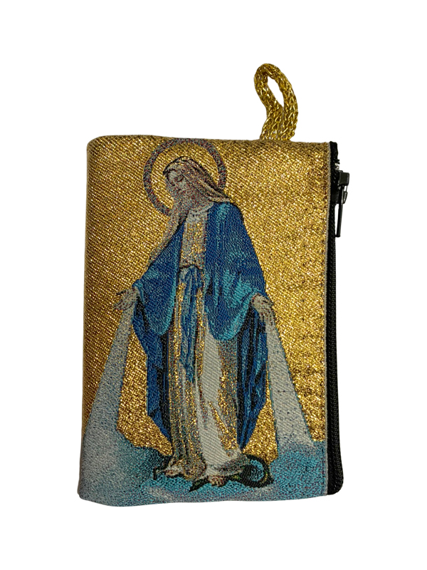 Pochette à l’effigie de Notre-Dame de la Médaille Miraculeuse, en tissu brodé sur fond doré, rappelant l’esprit des icônes byzantines.